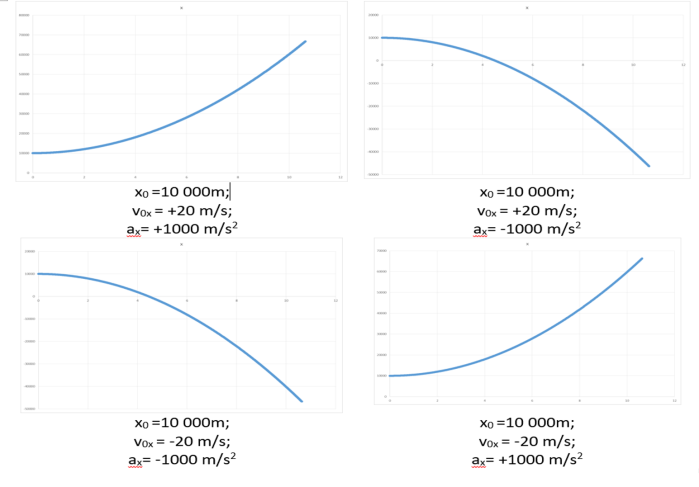 Joonistel on näha, et liikumisgraafiku ja ordinaattelje (vertikaalne, x-telg) lõikepunktiks on keha algasukoha koordinaat (x0). Parabool avaneb üles kui ax>0 ning alla kui ax<0.