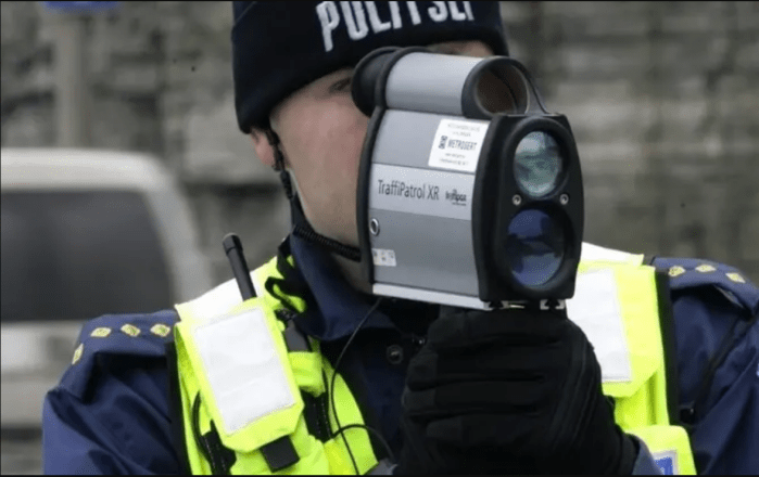 Fotol olev politseinik mõõdab kiirust taadeldud radariga. Seda kinnitab radaril olev kleebis.
