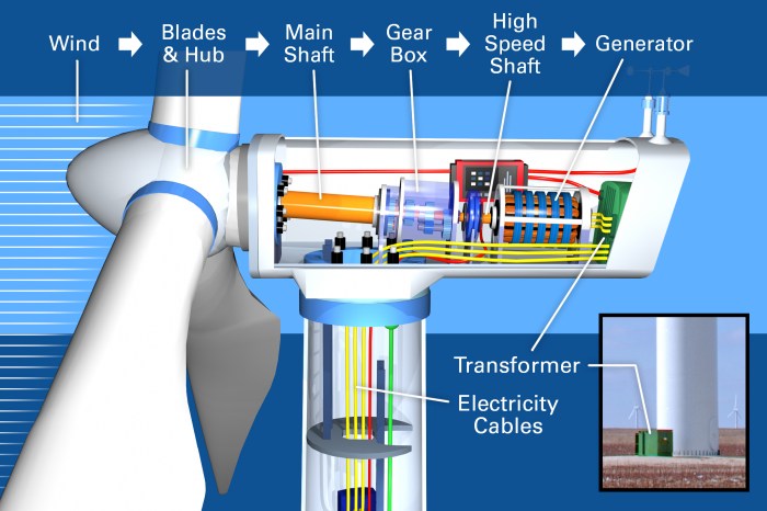 Tuul annab oma kineetilise energia rootori labadele, pannes need liikuma ning muundudes taoliselt õhuvoolude kulgliikumise kineetilisest energiast pöörlemise kineetiliseks energiaks. Pöörlemise energia antakse jõuülekande abil edasi generaatorisse, kus see elektrienergiaks muundatakse.