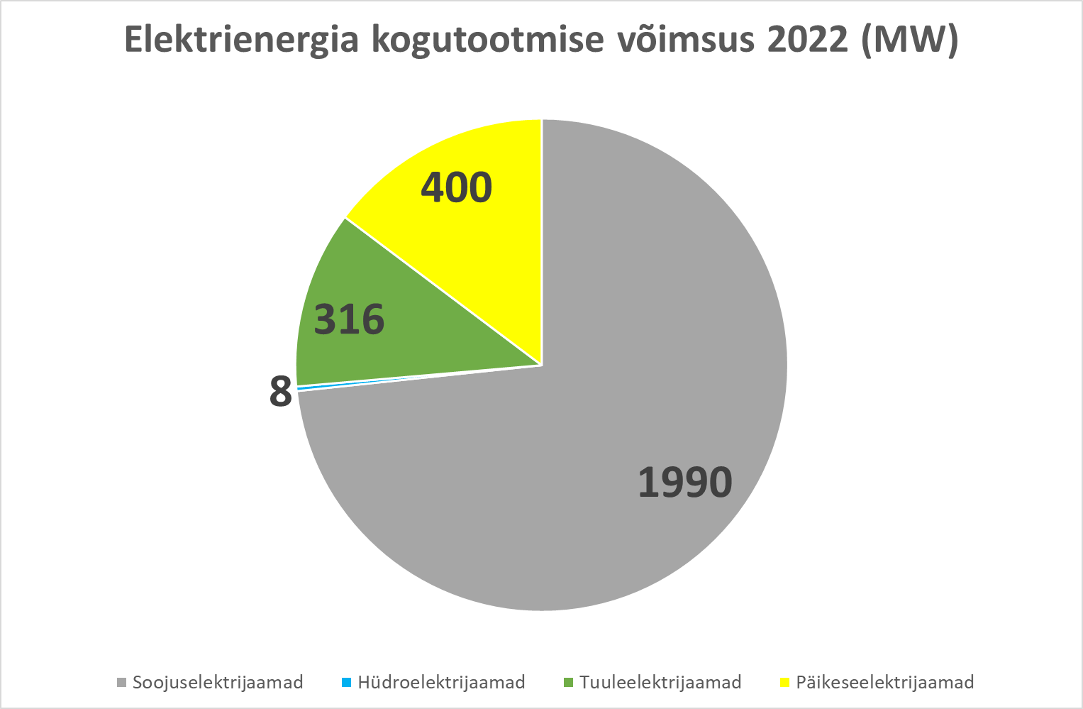 Kõigi Eestis tegutsevate elektrijaamade koguvõimsus oli Statistikaameti andmetel 2022. aastal 2,714GW = 2 714 MW = 2 714 000 kW ning see jagunes erinevate elektrijaamade tüüpide vahel nii, nagu on kujutatud järgmisel diagrammil